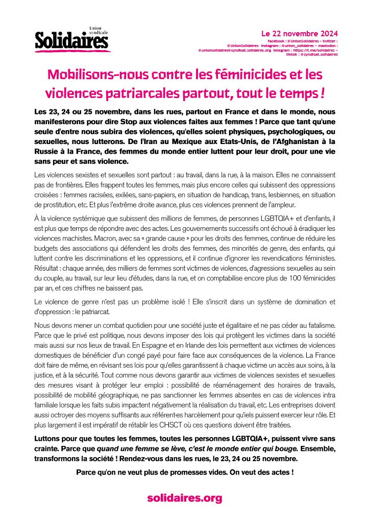 Les 23, 24 ou 25 novembre, dans les rues, partout en France et dans le monde, nous manifesterons pour dire Stop aux violences faites aux femmes ! Parce que tant qu'une seule d'entre nous subira des violences, qu'elles soient physiques, psychologiques, ou sexuelles, nous lutterons. De l'Iran au Mexique aux Etats-Unis, de l’Afghanistan à la Russie à la France, des femmes du monde entier luttent pour leur droit, pour une vie sans peur et sans violence.