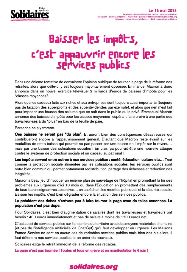 Alors que les cadeaux faits aux riches et aux entreprises sont toujours aussi importants (toujours pas de taxation des superprofits et des superdividendes par exemple), et alors que rien n’est fait pour imposer une hausse des salaires que ce soit dans le public ou le privé, Emmanuel Macron annonce des baisses d’impôts pour les classes moyennes” espérant faire croire à une partie des travailleur-ses à du “plus” en bas de la feuille de paie.
