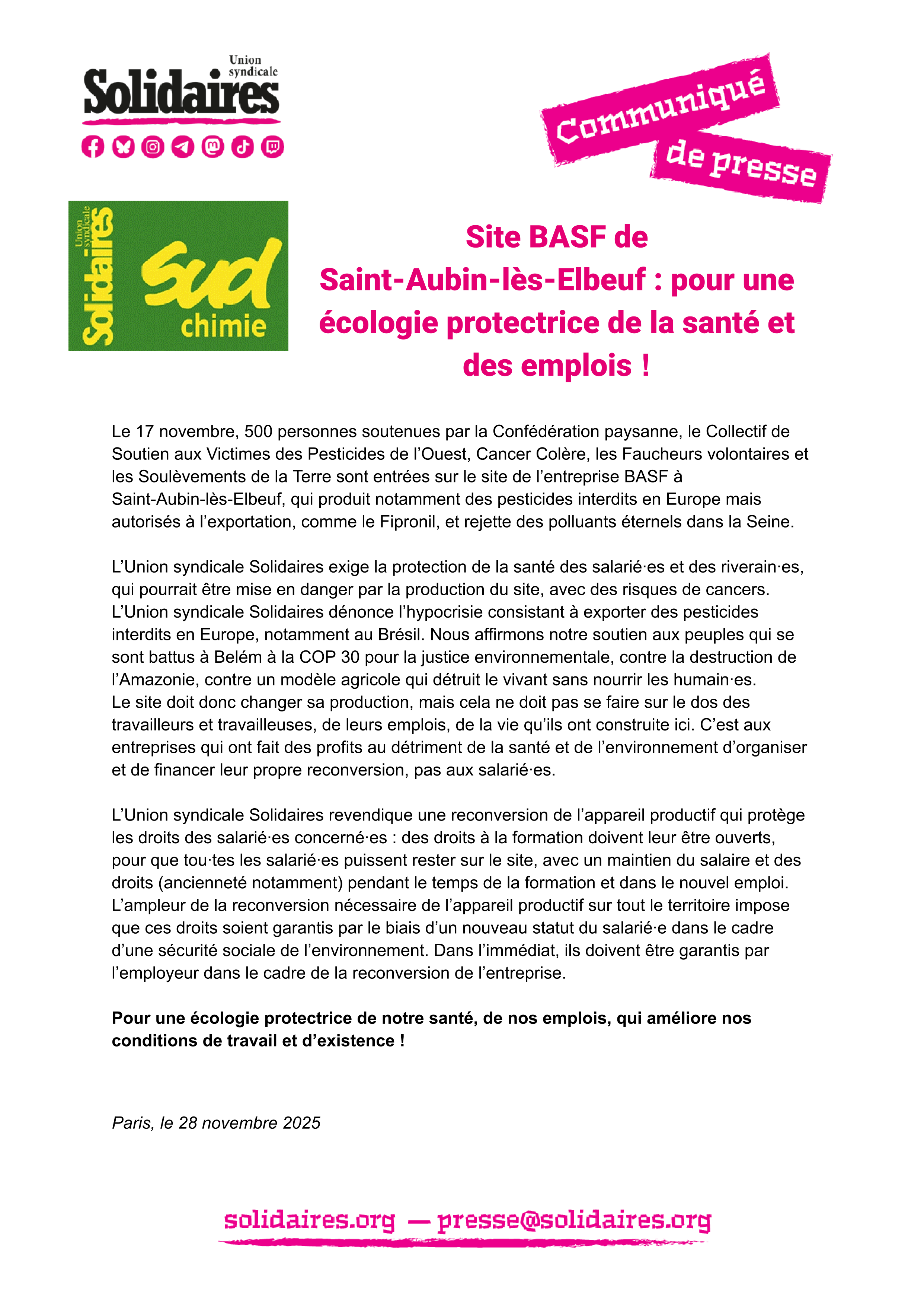 L’Union syndicale Solidaires dénonce l’hypocrisie consistant à exporter des pesticides interdits en Europe, notamment au Brésil. Nous affirmons notre soutien aux peuples qui se sont battus à Belém à la COP 30 pour la justice environnementale, contre la destruction de l’Amazonie, contre un modèle agricole qui détruit le vivant sans nourrir les humain∙es.