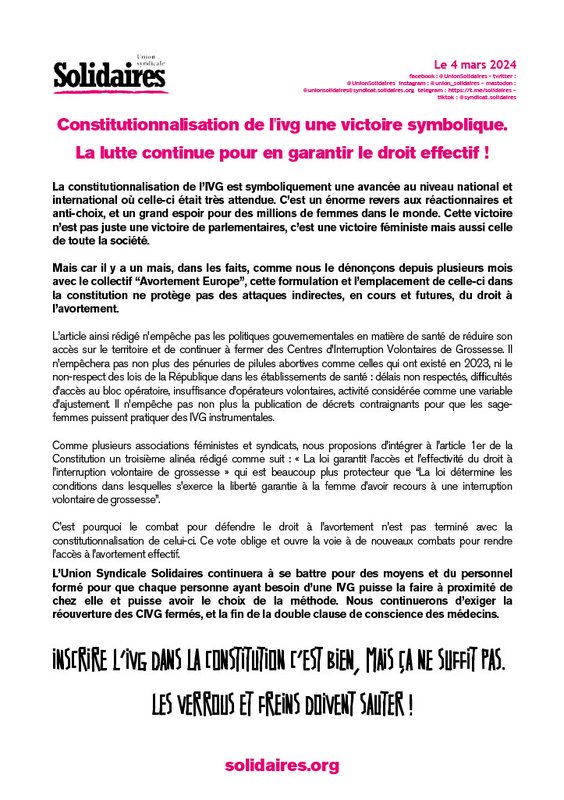 La constitutionnalisation de l’IVG est symboliquement une avancée au niveau national et international où celle-ci était très attendue. C’est un énorme revers aux réactionnaires et anti-choix, et un grand espoir pour des millions de femmes dans le monde. Cette victoire n’est pas juste une victoire de parlementaires, c’est une victoire féministe mais aussi celle de toute la société.