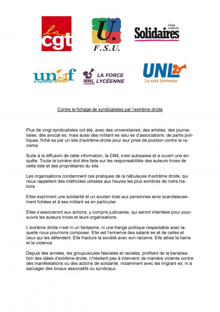 Plus de vingt syndicalistes ont été, avec des universitaires, des artistes, des journa-listes, des avocat·es, mais aussi des militant·es issu·es d’associations, de partis poli-tiques, fiché·es par un site d’extrême-droite pour leur prise de position contre le ra-cisme.