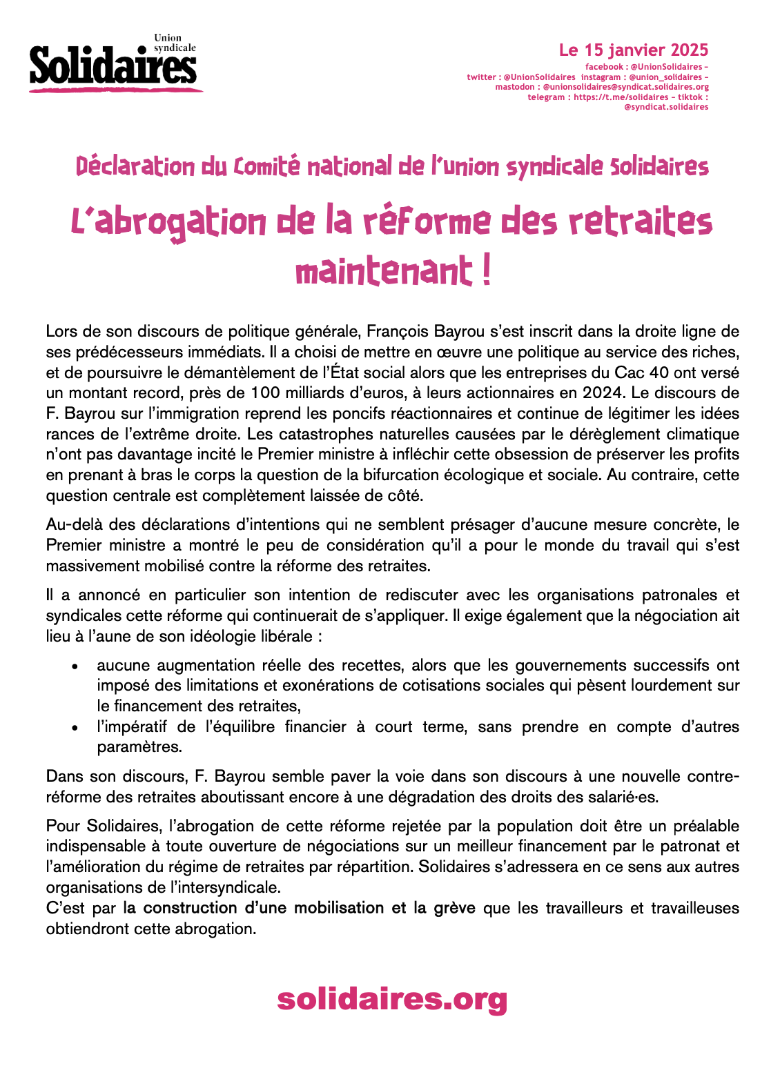 Pour Solidaires, l’abrogation de cette réforme rejetée par la population doit être un préalable indispensable à toute ouverture de négociations sur un meilleur financement par le patronat et l’amélioration du régime de retraites par répartition. Solidaires s’adressera en ce sens aux autres organisations de l’intersyndicale.