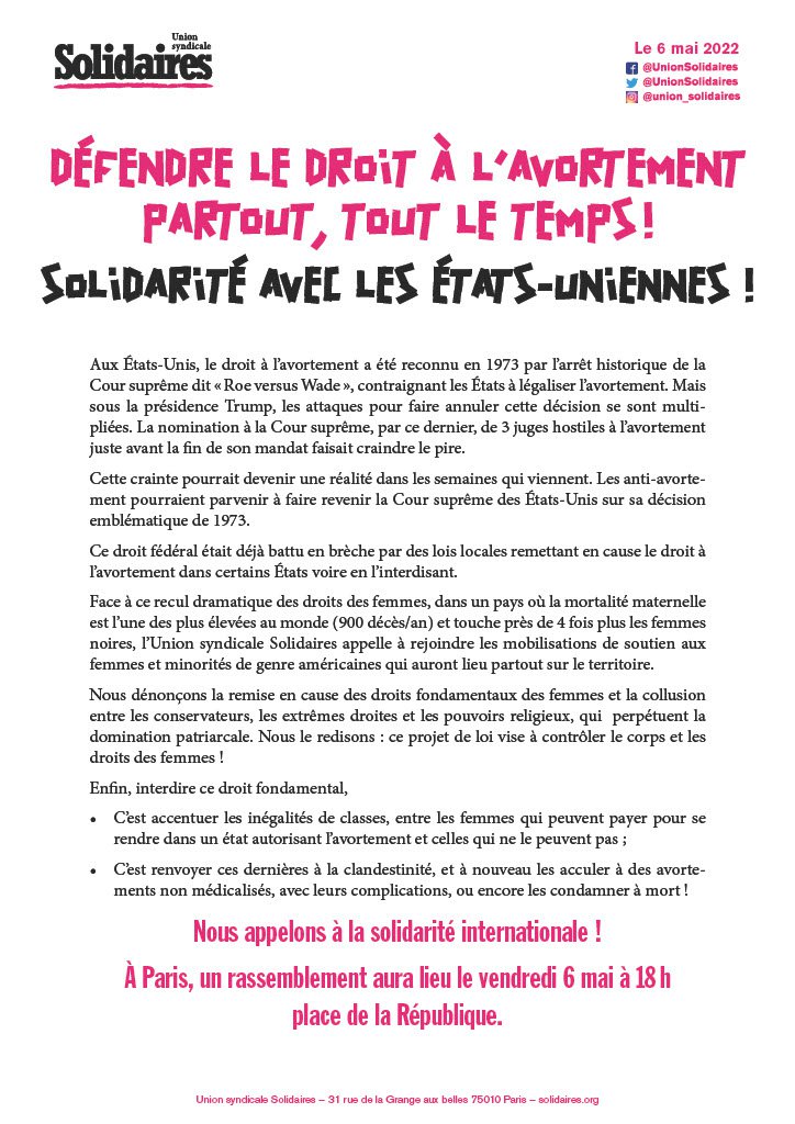 Face à ce recul dramatique des droits des femmes, dans un pays où la mortalité maternelle est l’une des plus élevées au monde (900 décès/an) et touche près de 4 fois plus les femmes noires, l’Union Syndicale Solidaires appelle à rejoindre les mobilisations de soutien aux femmes et minorités de genre américaines qui auront lieu partout sur le territoire.