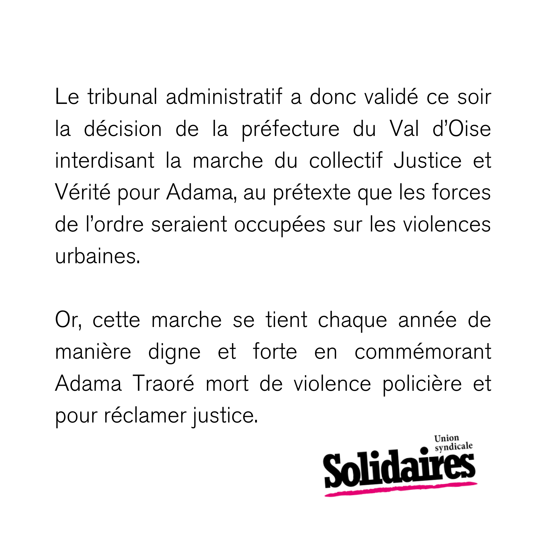 Le tribunal administratif a donc validé ce soir la décision de la préfecture du Val d’Oise interdisant la marche du collectif Justice et Vérité pour Adama, au prétexte que les forces de l’ordre seraient occupées sur les violences urbaines.