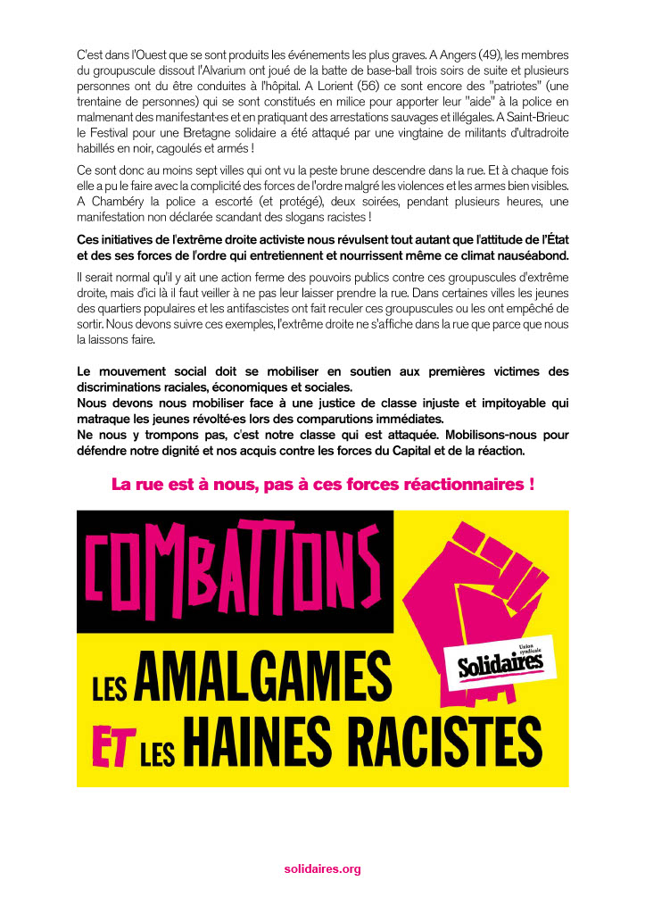 Il serait normal qu'il y ait une action ferme des pouvoirs publics contre ces groupuscules d'extrême droite, mais d'ici là il faut veiller à ne pas leur laisser prendre la rue. Dans certaines villes les jeunes des quartiers populaires et les antifascistes ont fait reculer ces groupuscules ou les ont empêché de sortir. Nous devons suivre ces exemples, l'extrême droite ne s'affiche dans la rue que parce que nous la laissons faire.