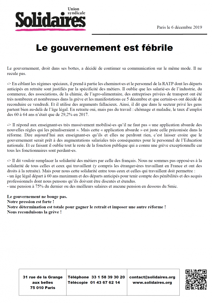 • En ciblant les régimes spéciaux, il prend à partie les cheminot-es et le personnel de la RATP dont les départs anticipés en retraite sont justifiés par la spécificité des métiers. Il oublie que les salarié-es de l’industrie, du commerce, des associations, de la chimie, de l’agro-alimentaire, des entreprises privées de transport ont été très nombreux et nombreuses dans la grève et les manifestations ce 5 décembre et que certain-es ont décidé de reconduire ce vendredi. Et il utilise des arguments fallacieux. Ainsi, il dit que dans le secteur privé les gens partent bien au-delà de l’âge légal. En retraite oui, mais pas du travail : chômage et maladie, le taux d’emploi des 60 à 64 ans n’était que de 29,2% en 2017.