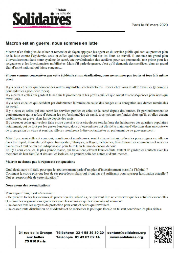 Macron n’en finit plus de saluer et remercier de façon appuyée les agent-es du service public qui sont au premier plan de la lutte contre l’épidémie, ceux et celles qui sont aujourd’hui sur les lieux de travail. Il annonce un grand plan d’investissement dans notre système de santé, une revalorisation des carrières pour ses personnels, une prime pour les soignant-es et les fonctionnaires mobilisé·es. Mais s’il parle de guerre, c’est qu’il demande des sacrifices, dans un grand élan d’unité national qui laisse songeur…