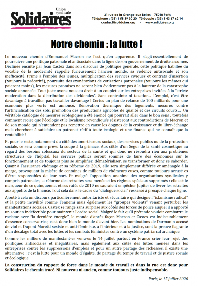 La construction du rapport de force dans le monde du travail et dans la rue est donc pour Solidaires le chemin tracé. Ni nouveau ni ancien, comme toujours juste indispensable.