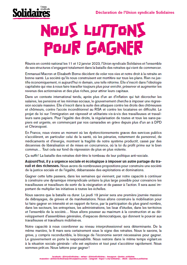 Réunis en comité national les 11 et 12 janvier 2023, l’Union syndicale Solidaires et l’ensemble de ses structures s’engagent totalement dans la bataille des retraites qui vient de commencer.