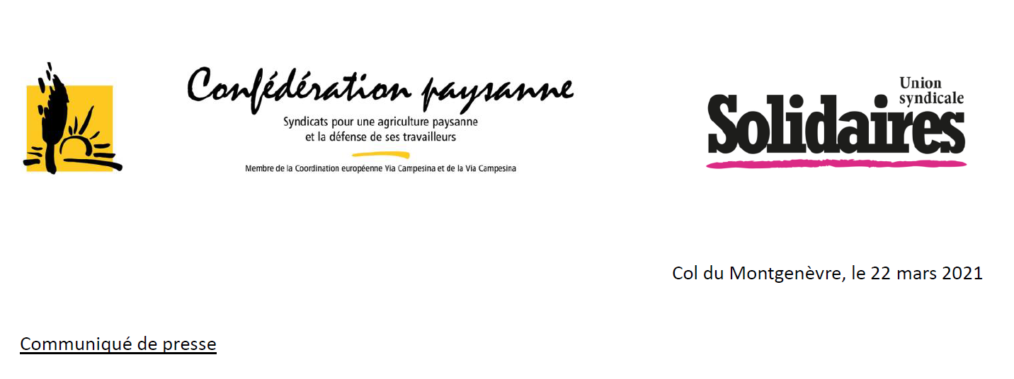 Pour une société respectueuse de tout-e-s, la liberté de circulation, la liberté d’installation et la régularisation sans condition de tout-e-s les migrant-e-s sont impératives. Dans ce contexte de répression la Confédération paysanne et l’union syndicale Solidaires réaffirment leur engagement auprès de toutes celles et ceux qui luttent pour la dignité humaine et aident les populations démunies.