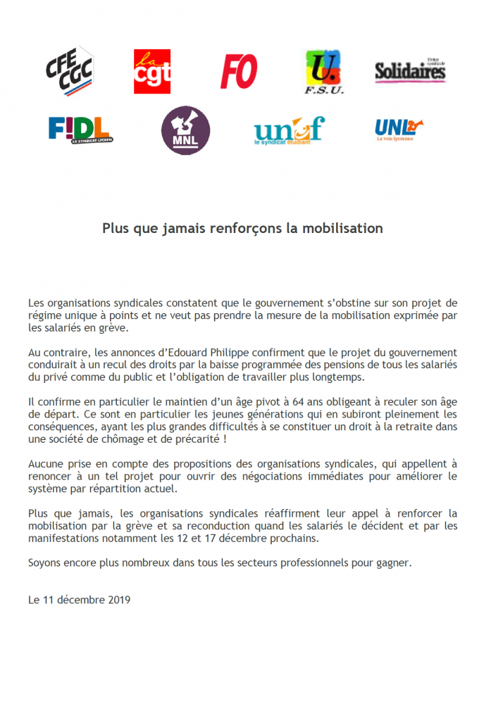 Plus que jamais, les organisations syndicales réaffirment leur appel à renforcer la mobilisation par la grève et sa reconduction quand les salariés le décident et par les manifestations notamment les 12 et 17 décembre prochains.
