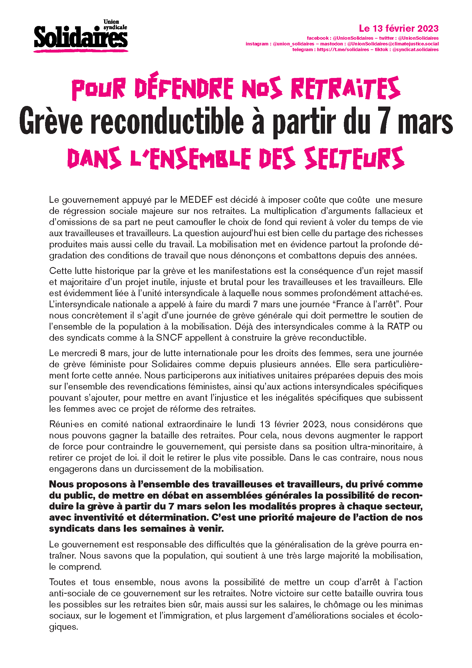 Réuni·es en comité national extraordinaire le lundi 13 février 2023, nous considérons que nous pouvons gagner la bataille des retraites. Pour cela, nous devons augmenter le rapport de force pour contraindre le gouvernement, qui persiste dans sa position ultra-minoritaire, à retirer ce projet de loi. il doit le retirer le plus vite possible. Dans le cas contraire, nous nous engagerons dans un durcissement de la mobilisation.