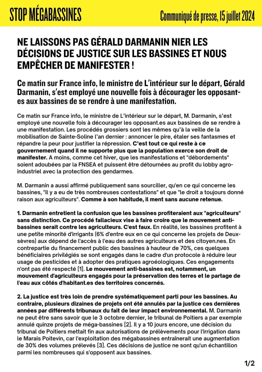Ce matin du 15 juillet 2024 sur France info, le ministre de L’intérieur sur le départ, M. Darmanin, s’est employé une nouvelle fois à décourager les opposant.es aux bassines de se rendre à une manifestation.