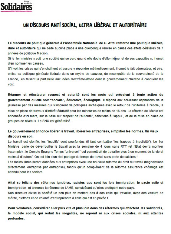 Le discours de politique générale à l'Assemblée Nationale de G. Attal renforce une politique libérale, dure et autoritaire qui ne cède aucune place à une quelconque remise en cause des effets délétères de 7 années de politique Macron.