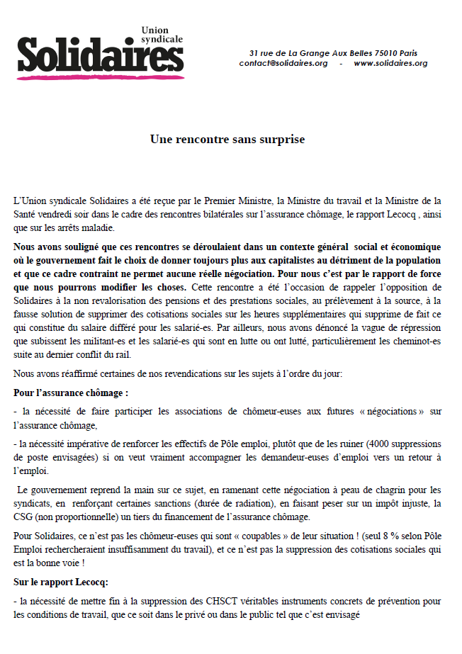 L’Union syndicale Solidaires a été reçue par le Premier Ministre, la Ministre du travail et la Ministre de la Santé vendredi soir dans le cadre des rencontres bilatérales sur l’assurance chômage, le rapport Lecocq, ainsi que sur les arrêts maladie.