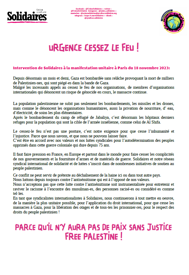 Intervention de Solidaires à la manifestation unitaire à Paris du 18 novembre 2023 :