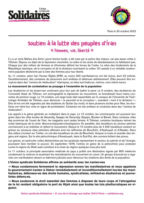 Message du Collectif syndical français aux travailleuses et travailleurs d’Iran à l’occasion du 1er mai 2023