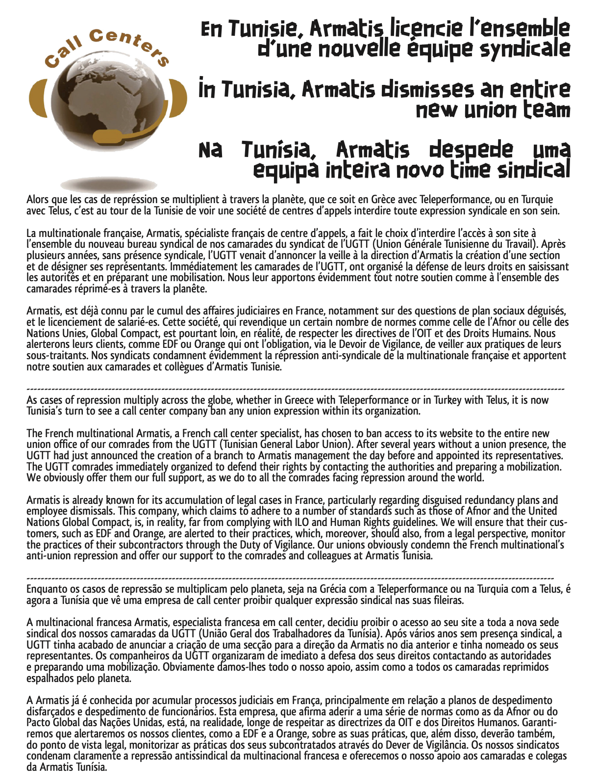 La multinationale française, Armatis, spécialiste français de centre d’appels, a fait le choix d’interdire l’accès à son site à l’ensemble du nouveau bureau syndical de nos camarades du syndicat de l’UGTT (Union Générale Tunisienne du Travail). Après plusieurs années, sans présence syndicale, l’UGTT venait d’annoncer la veille à la direction d’Armatis la création d’une section et de désigner ses représentants. Immédiatement les camarades de l’UGTT, ont organisé la défense de leurs droits en saisissant les autorités et en préparant une mobilisation. Nous leur apportons évidemment tout notre soutien comme à l’ensemble des camarades réprimé-es à travers la planête.