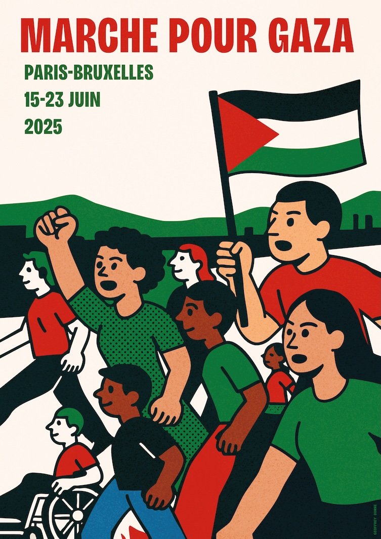 Les co-organisateurs de cette initiative la LDH (Ligue des droits de l’Homme), la CGT, l’Association Belgo-Palestinienne (ABP), l’Association France Palestine Solidarité (AFPS), la FSU, l’Union Syndicale Solidaires et la Fédération internationale pour les droits humains (FIDH) feront de chaque étape un évènement de mobilisation. Plusieurs personnalités engagées soutiennent d’ores et déjà la marche comme la comédienne Corinne Masiero, le comédien Swann Arlaud, la chanteuse Clara Ysé ou encore l’autrice et metteuse en scène Lorraine de Sagazan…