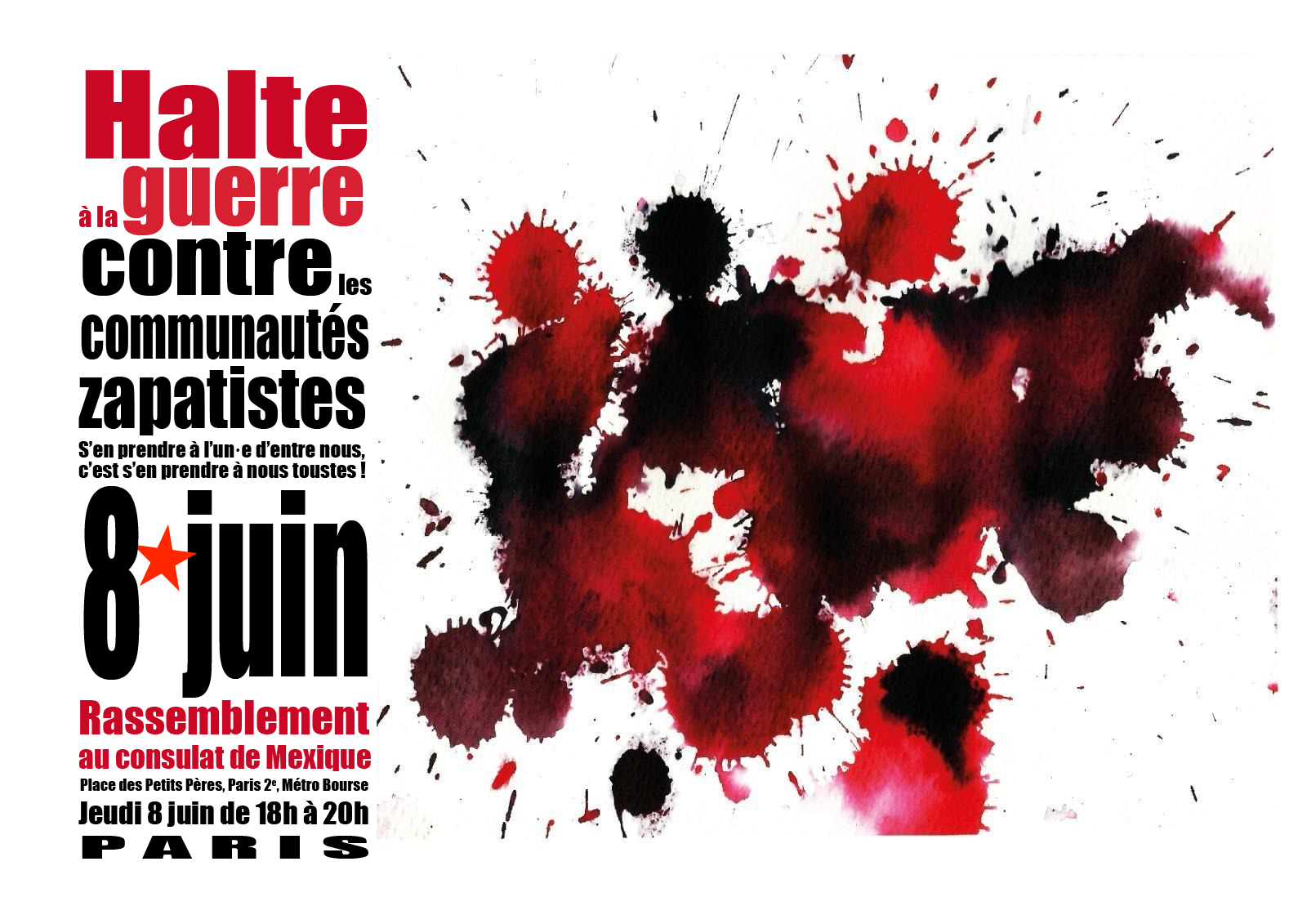Nous appelons à unir nos efforts pour tisser une journée d’action diffuse, du 27 mai au 10 juin, avec une action coordonnée nationale et internationale le 8 juin.De même, nous exigeons la libération immédiate de Manuel Gómez, appui de l’EZLN, dont nous n’oublions pas l’injuste incarcération.