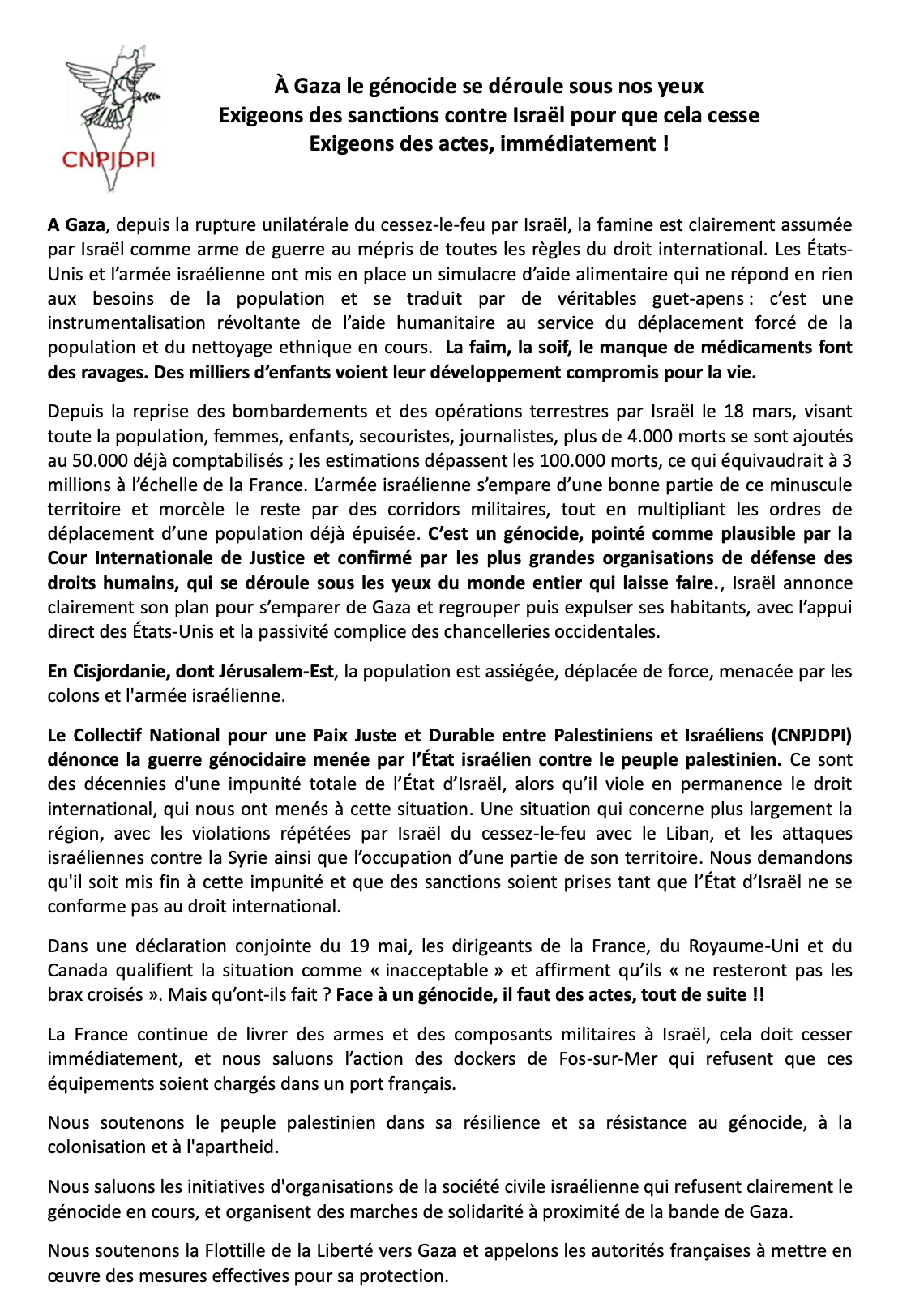 Le Collectif National pour une Paix Juste et Durable entre Palestiniens et Israéliens (CNPJDPI) dénonce la guerre génocidaire menée par l’État israélien contre le peuple palestinien. Ce sont des décennies d'une impunité totale de l’État d’Israël, alors qu’il viole en permanence le droit international, qui nous ont menés à cette situation. Une situation qui concerne plus largement la région, avec les violations répétées par Israël du cessez-le-feu avec le Liban, et les attaques israéliennes contre la Syrie ainsi que l’occupation d’une partie de son territoire. Nous demandons qu'il soit mis fin à cette impunité et que des sanctions soient prises tant que l’État d’Israël ne se conforme pas au droit international.