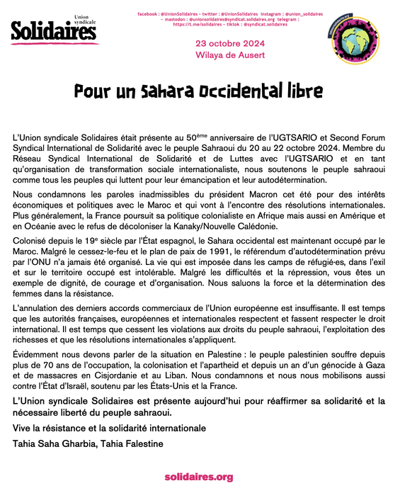 L’Union syndicale Solidaires était présente au 50ème anniversaire de l’UGTSARIO et Second Forum Syndical International de Solidarité avec le peuple Sahraoui du 20 au 22 octobre 2024. Membre du Réseau Syndical International de Solidarité et de Luttes avec l’UGTSARIO et en tant qu’organisation de transformation sociale internationaliste, nous soutenons le peuple sahraoui comme tous les peuples qui luttent pour leur émancipation et leur autodétermination.