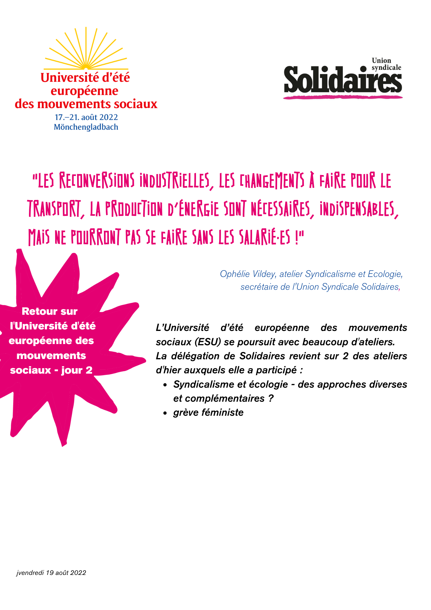 Ces journées seront renouvelées en janvier 2023 et s'intègrerons dans la campagne “Partageons le Travail” de Solidaires. Nous devons accélérer la réflexion et les propositions concrètes dans les syndicats sur le sujet, en particulier sur la question des reconversions écologiques. Quelles revendications et quels leviers dans nos secteurs et territoires pour faire face à l’urgence climatique ? Et Solidaires a également proposé à la FSU et à la CGT d’organiser des rencontres intersyndicales écologistes qui devraient se mettre en place à l’automne 2023.