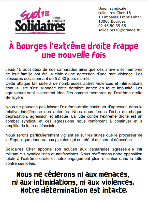 Nous serons particulièrement vigilant·es sur les suites que le procureur de la République donnera aux plaintes qui ont été et qui seront déposées. Solidaires Cher apporte son soutien aux camarades agressé·e·s car militant·e·s syndicalistes et antifascistes. Nous réaffirmons notre opposition totale à l’extrême droite et notre engagement plein et entier dans la lutte contre ses idées. Nous ne céderons ni aux menaces, ni aux intimidations, ni aux violences. Notre détermination est intacte