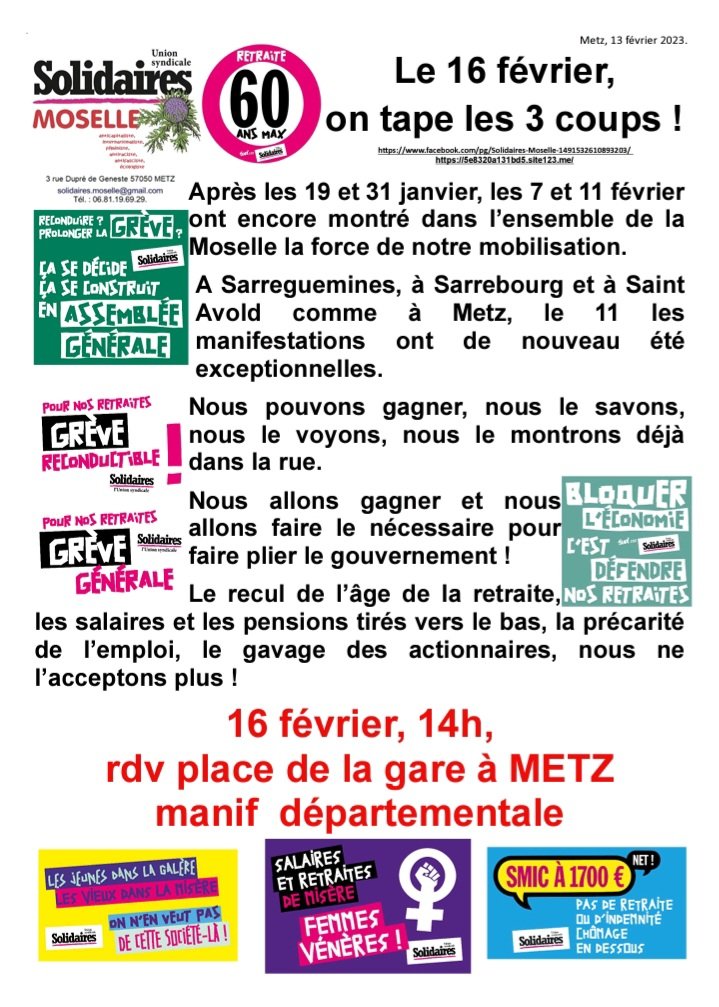 Après les 19 et 31 janvier, les 7 et 11 février ont encore montré dans l ’ensemble de la Moselle la force de notre mobilisation.