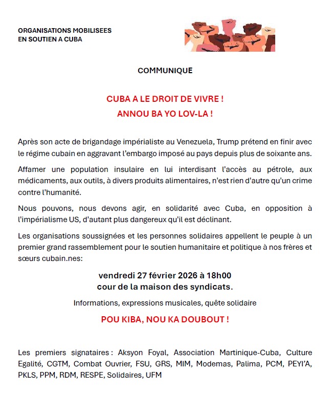C'est naturellement que nous rejoignons le collectif qui appelle à un meeting de solidarité, le vendredi 27 février, à 18 heures, à la maison des syndicats, à Fort-de-France.