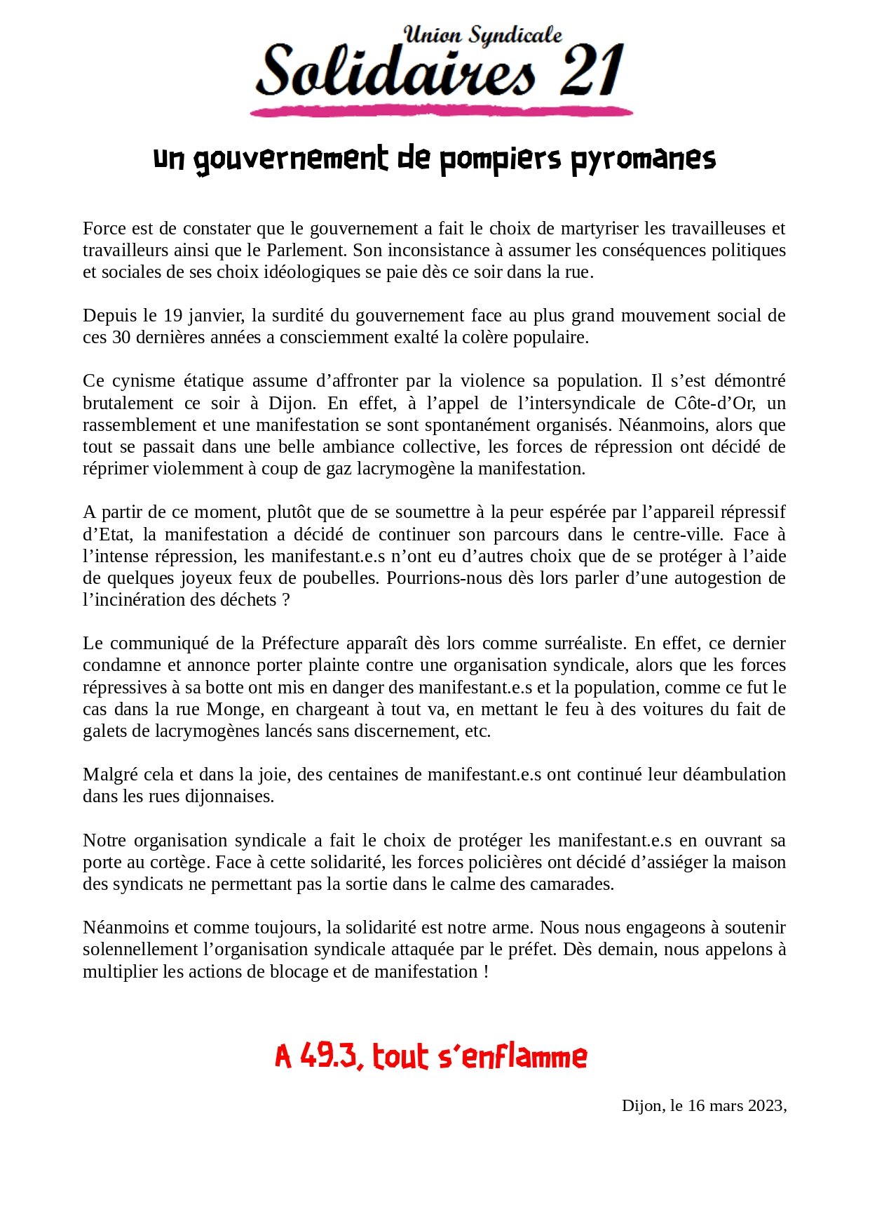 Ce cynisme étatique assume d’affronter par la violence sa population. Il s’est démontré brutalement ce soir à Dijon. En effet, à l’appel de l’intersyndicale de Côte-d’Or, un rassemblement et une manifestation se sont spontanément organisés. Néanmoins, alors que tout se passait dans une belle ambiance collective, les forces de répression ont décidé de réprimer violemment à coup de gaz lacrymogène la manifestation.