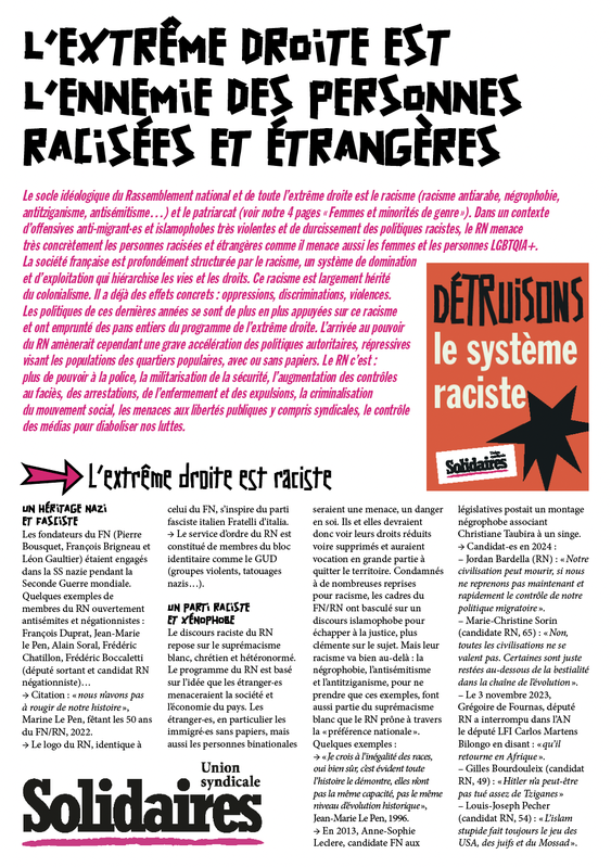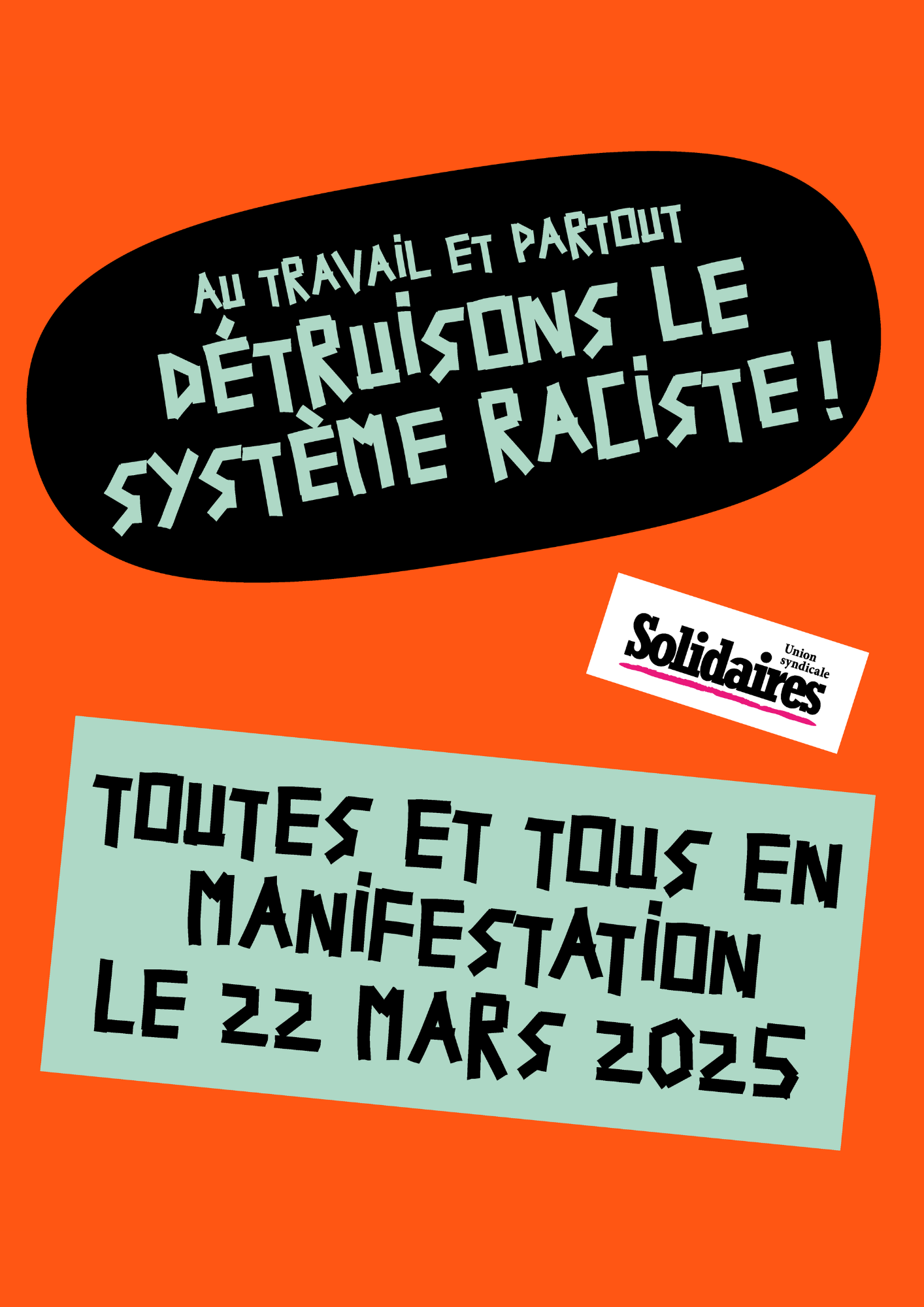 L’Union syndicale Solidaires continuera à lutter avec celles et ceux qui subissent les oppressions racistes au travail, dans nos quartiers et dans la société. Nous continuerons à nous battre pour la justice, pour l'égalité des droits, contre le racisme, pour la régularisation des travailleurs-ses sans papiers, la liberté de circulation et une société juste et libre d'oppressions !