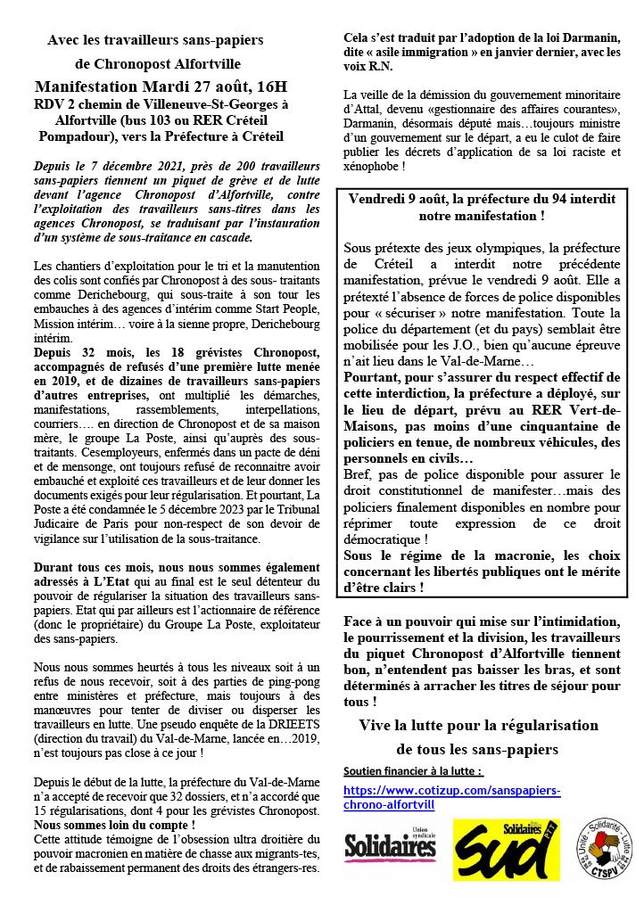 Communiqué de presse : le Vendredi 9 août, la préfecture du 94 interdit notre manifestation ! Sous prétexte des jeux olympiques, la préfecture de Créteil a interdit notre précédente manifestation, prévue le vendredi 9 août. Elle a prétexté l’absence de forces de police disponibles pour « sécuriser » notre manifestation. Toute la police du département (et du pays) semblait être mobilisée pour les J.O., bien qu’aucune épreuve n’ait lieu dans le Val-de-Marne… Pourtant, pour s’assurer du respect effectif de cette interdiction, la préfecture a déployé, sur le lieu de départ, prévu au RER Vert-de- Maisons, pas moins d’une cinquantaine de policiers en tenue, de nombreux véhicules, des personnels en civils…