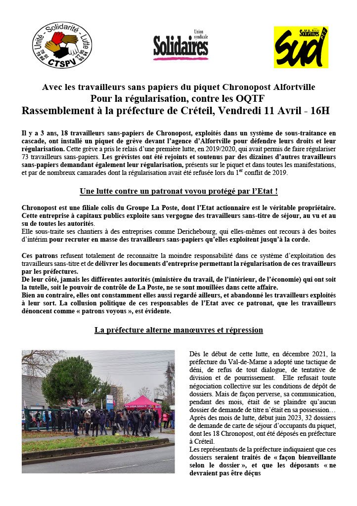 Avec les travailleurs sans papiers du piquet Chronopost Alfortville Pour la régularisation, contre les OQTF Rassemblement à la préfecture de Créteil, Vendredi 11 Avril - 16H