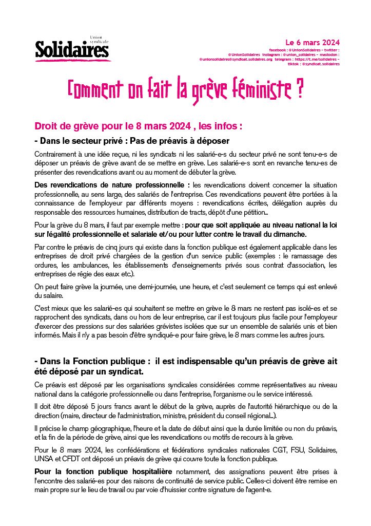 Pour le 8 mars 2024, les confédérations et fédérations syndicales nationales CGT, FSU, Solidaires, UNSA et CFDT ont déposé un préavis de grève qui couvre toute la fonction publique.