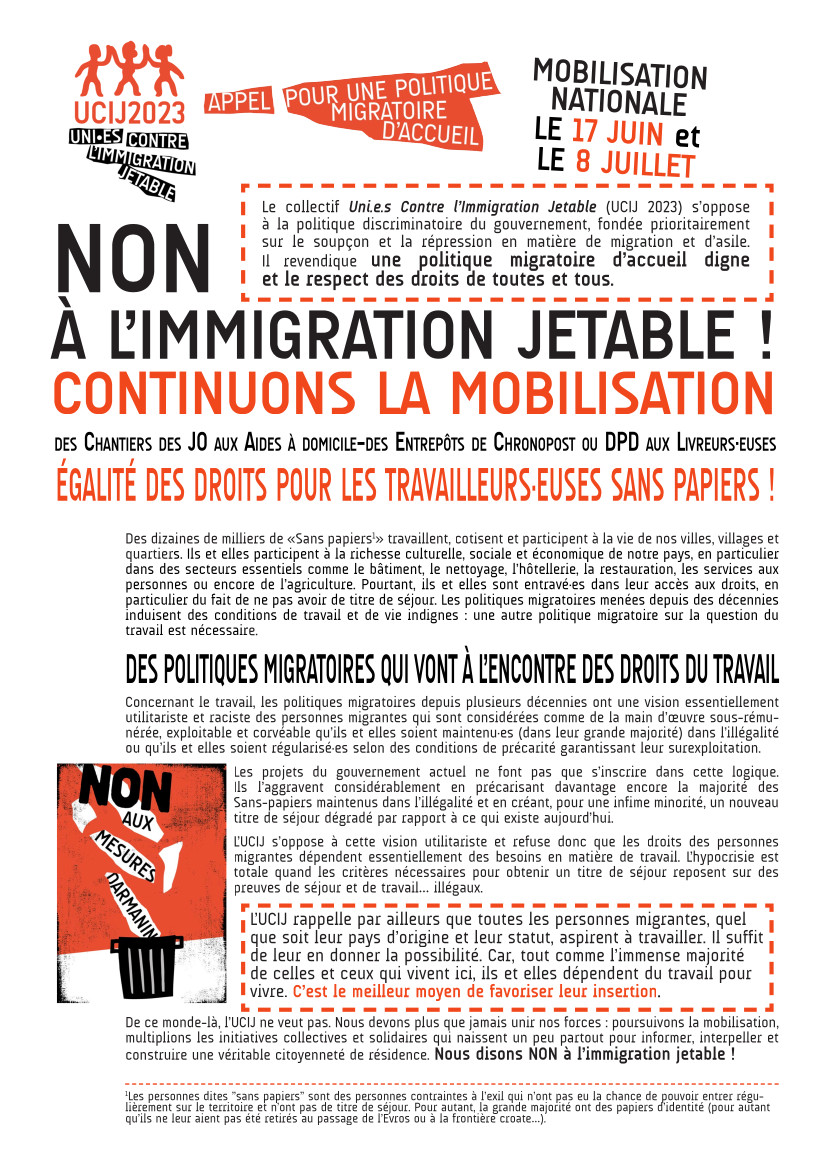 L’UCIJ (Uni·es contre l'Immigration Jetable, Pour une Politique Migratoire d'Accueil) s’oppose à cette vision utilitariste et refuse donc que les droits des personnes migrantes dépendent essentiellement des besoins en matière de travail. L’hypocrisie est totale quand les critères nécessaires pour obtenir un titre de séjour reposent sur des preuves de séjour et de travail… illégaux.