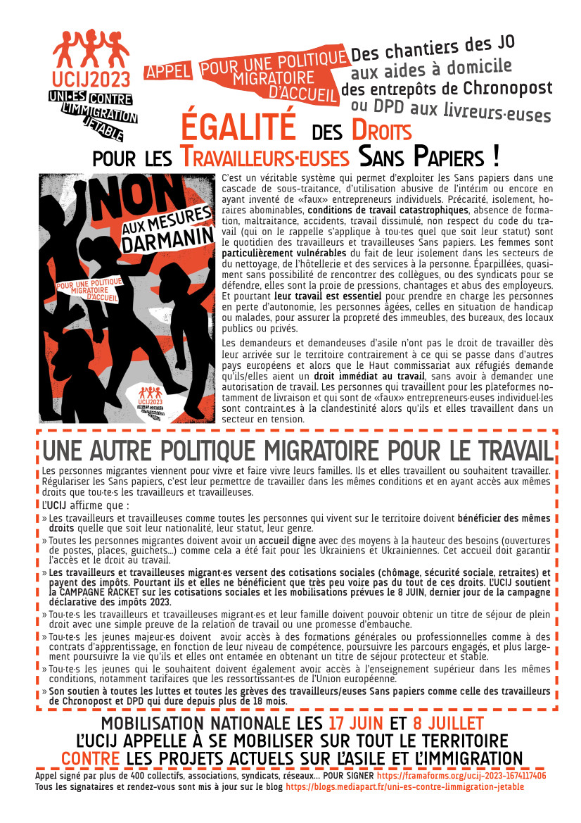 ➢ Les travailleurs et travailleuses migrant∙es versent des cotisations sociales (chômage, sécurité sociale, retraites) et payent des impôts. Pourtant ils et elles ne bénéficient que très peu voire pas du tout de ces droits. L’UCIJ soutient la campagne Racket sur les cotisations sociales et les mobilisations prévues le 8 juin, dernier jour de la campagne déclarative des impôts 2023.