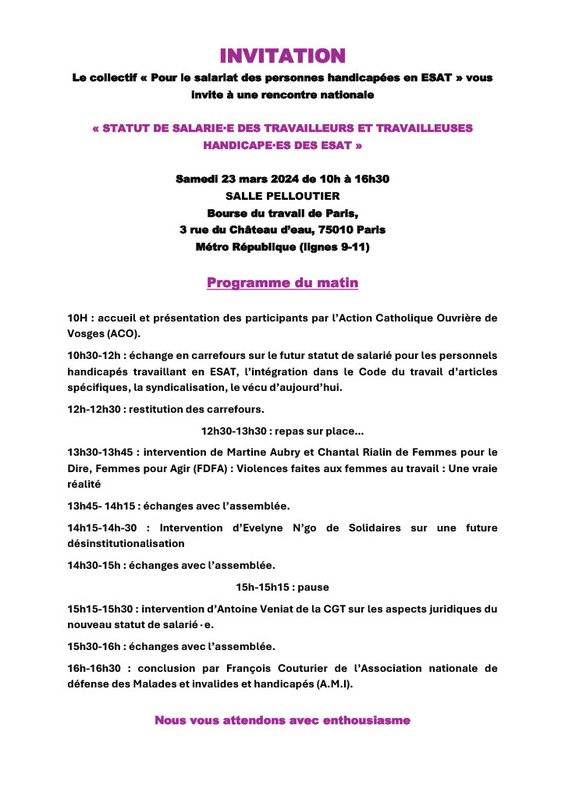 Le collectif « Pour le salariat des personnes handicapées en ESAT » vous invite à une rencontre nationale « Statut de salarié∙e des travailleurs et travailleuses handicapé∙es des ESAT »