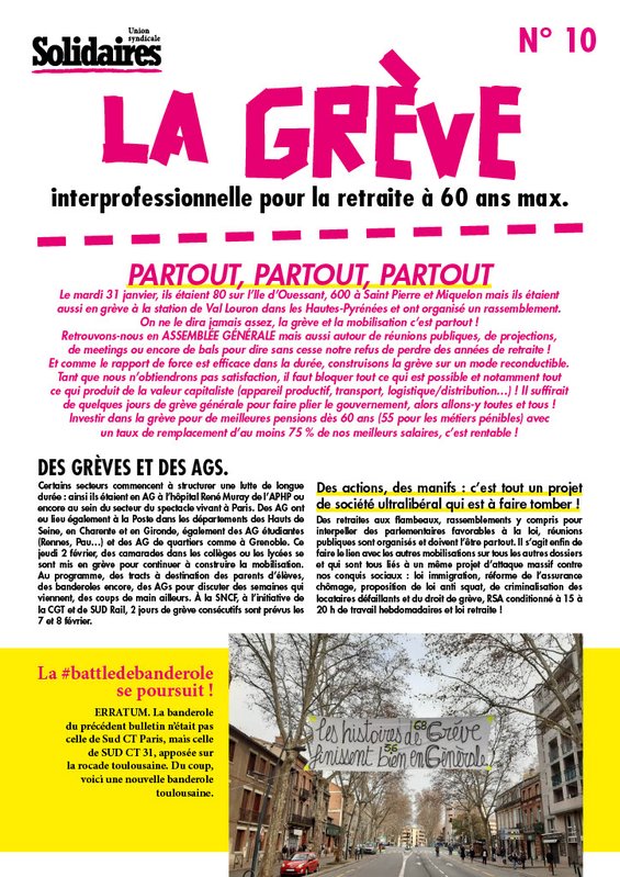Certains secteurs commencent à structurer une lutte de longue durée : ainsi ils étaient en AG à l’hôpital René Muray de l’APHP ou encore au sein du secteur du spectacle vivant à Paris. Des AG ont eu lieu également à la Poste dans les départements des Hauts de Seine, en Charentes et en Gironde, également des AG étudiantes (Rennes, Pau…) et des AG de quartiers comme à Grenoble. Ce jeudi 2 février, des camarades dans les collèges ou les lycées se sont mis en grève pour continuer à construire la mobilisation. Au programme, des tracts à destination des parents d'élèves, des banderoles encore, des AGs pour discuter des semaines qui viennent, des coups de main ailleurs. A la SNCF, à l’initiative de la CGT et de SUD Rail, 2 jours de grève consécutifs sont prévus les 7 et 8 février.
