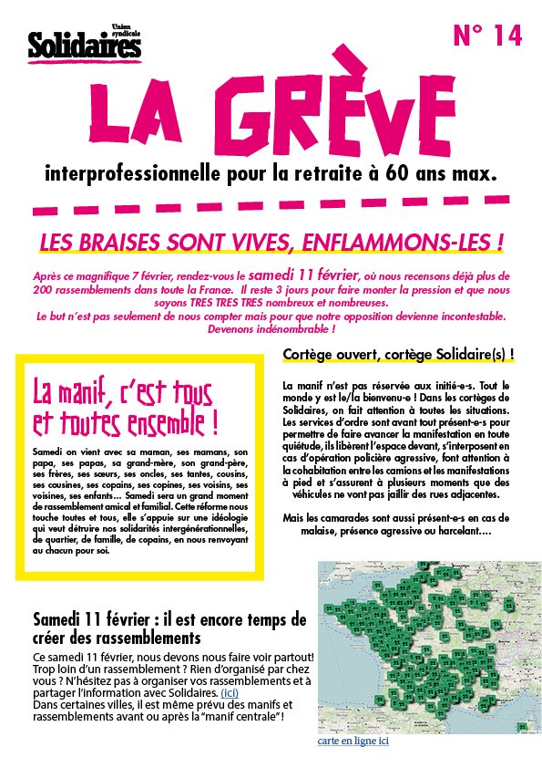 Ce samedi 11 février, nous devons nous faire voir partout ! Trop loin d’un rassemblement ? Rien d'organisé par chez vous ? N’hésitez pas à organiser vos rassemblements età faire partager l’information avec Solidaires. . Dans certaines villes, il est même prévu des manifs et rassemblements avant ou après la “manif centrale” ! Une mise à jour de la carte sera faite régulièrement.