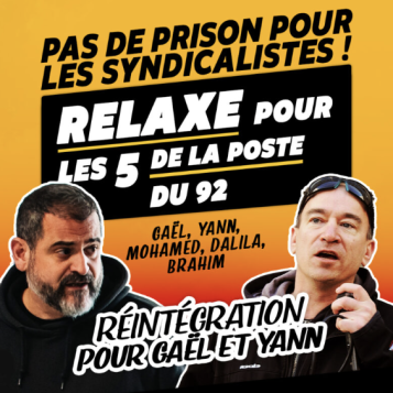 L’examen futur par la Cour Européenne des Droits de l’Homme du recours déposé par Gaël pour sa réintégration nous offre l’opportunité d’exiger que nos deux collègues et camarades soient réintégrés de plein droit au sein de leur entreprise ainsi que tous ceux et celles qui ont été révoqués ou licenciés pour des faits syndicaux. Derrière les cas emblématiques de Yann et de Gaël, se joue le sort de toutes celles et ceux qui se battent sans relâche contre toutes les politiques menées à l’encontre des intérêts du monde du travail. Faisons du 12 juin le procès de la répression patronale et d’État, l’occasion de ne plus subir, mais au contraire de faire bloc !