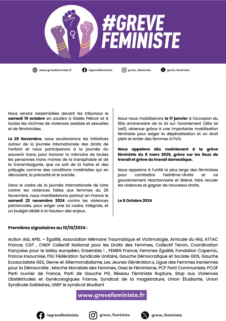 Le collectif Grève Féministe réunit associations féministes et généralistes de lutte pour les droits et organisations syndicales et politiques. Elles dénoncent la mise en place de ce gouvernement réactionnaire, autoritaire et libéral, qui fait des propositions directement inspirées de l’extrême droite, à l’opposé du résultat des élections législatives qui ont placé en tête la coalition du Nouveau Front Populaire, sans donner de fait une quelconque majorité même relative aux organisations et courants politiques représentés dans le nouveau gouvernement Barnier de septembre 2024.