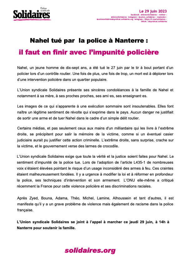 L’Union syndicale Solidaires se joint à l’appel à marcher ce jeudi 29 juin, à 14h à Nanterre pour soutenir la famille.