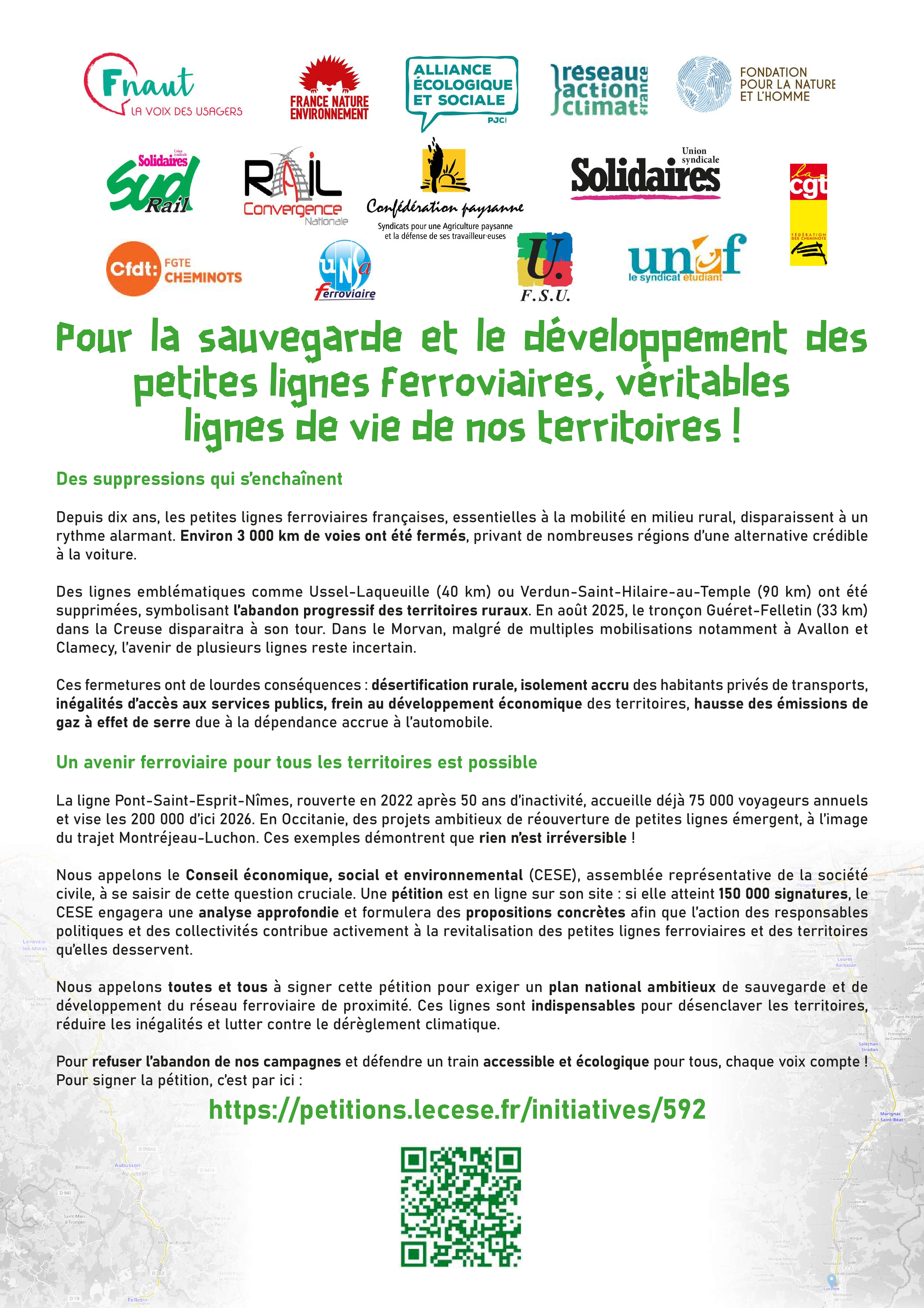 Nous appelons toutes et tous à signer cette pétition pour exiger un plan national ambitieux de sauvegarde et de développement du réseau ferroviaire de proximité. Ces lignes sont indispensables pour désenclaver les territoires, réduire les inégalités et lutter contre le dérèglement climatique.