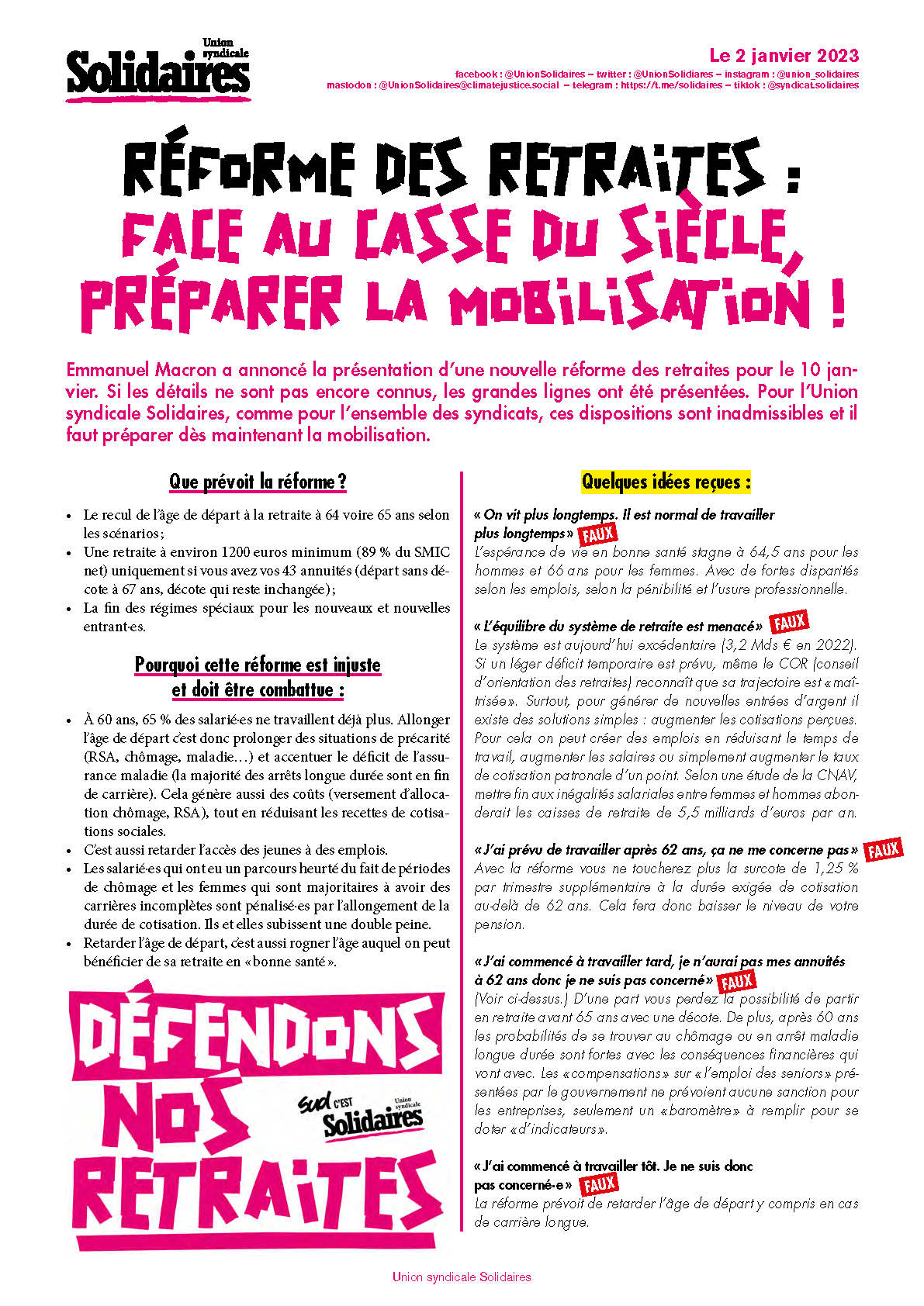 Solidaires invite à se réunir dès maintenant en assemblées générales, heures d’information syndicales, réunions… pour discuter entre collègues de cette réforme et se préparer à riposter.