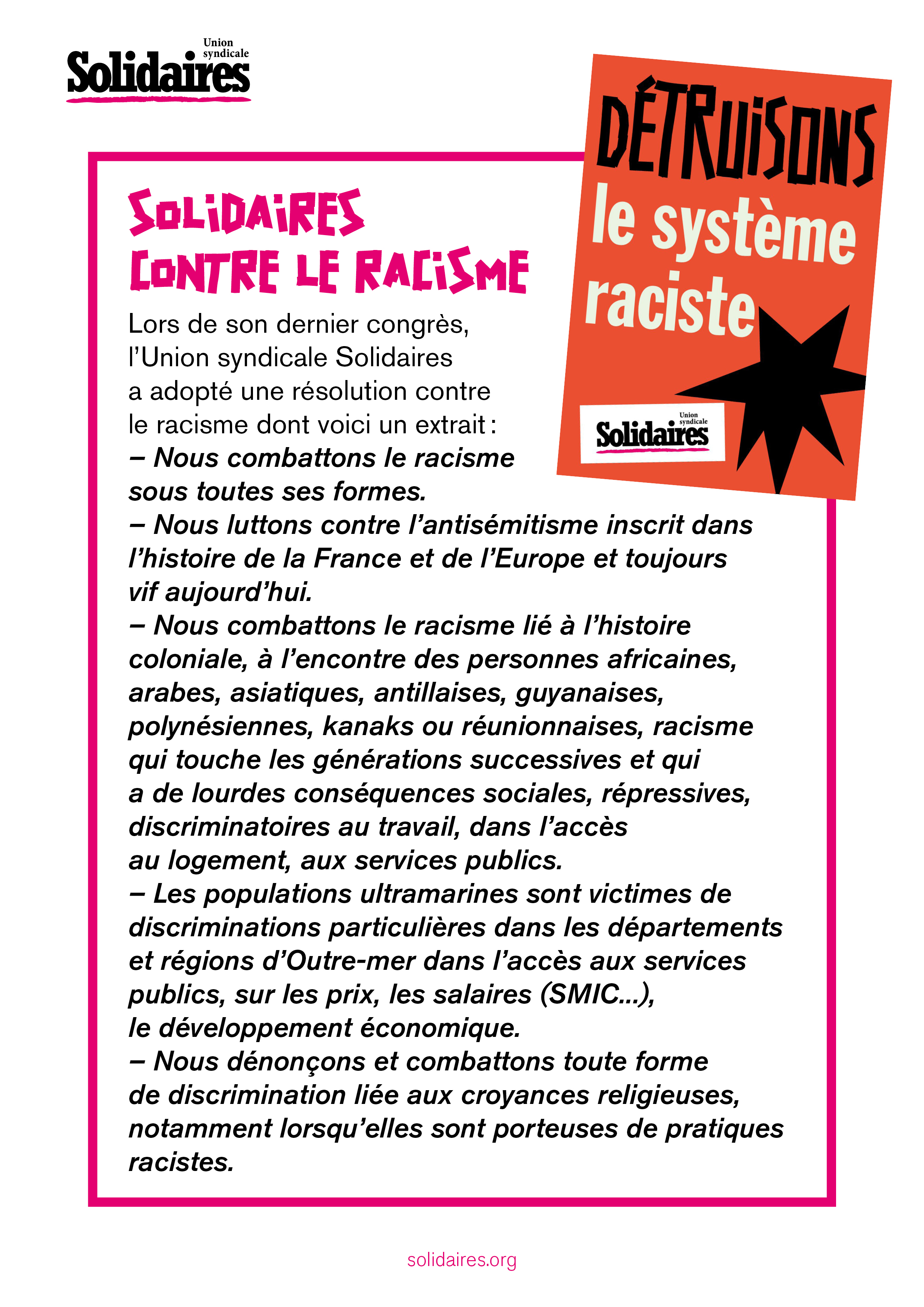 Lors de son dernier congrès, l’Union syndicale Solidaires a adopté une résolution contre le racisme dont voici un extrait :