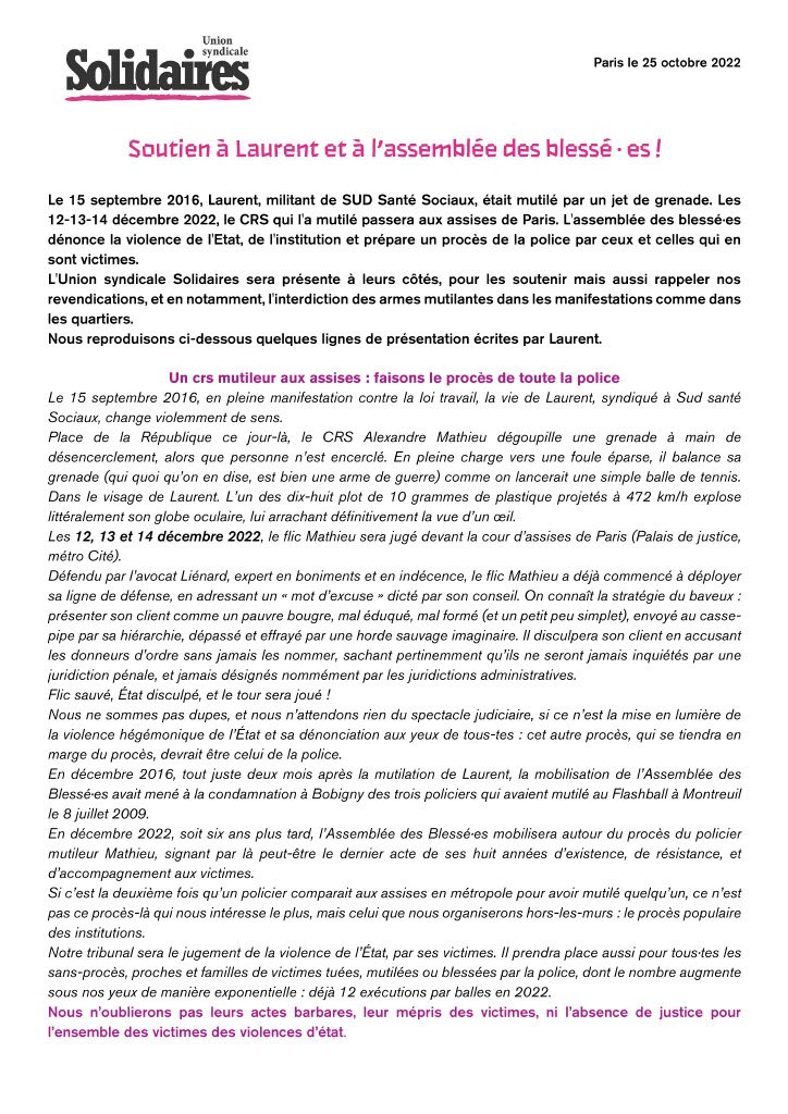 Le 15 septembre 2016, Laurent, militant de SUD Santé Sociaux, était mutilé par un jet de grenade. Les 12-13-14 décembre 2022, le CRS qui l'a mutilé passera aux assises de Paris. L'assemblée des blessé∙es dénonce la violence de l'Etat, de l'institution et prépare un procès de la police par ceux et celles qui en sont victimes.