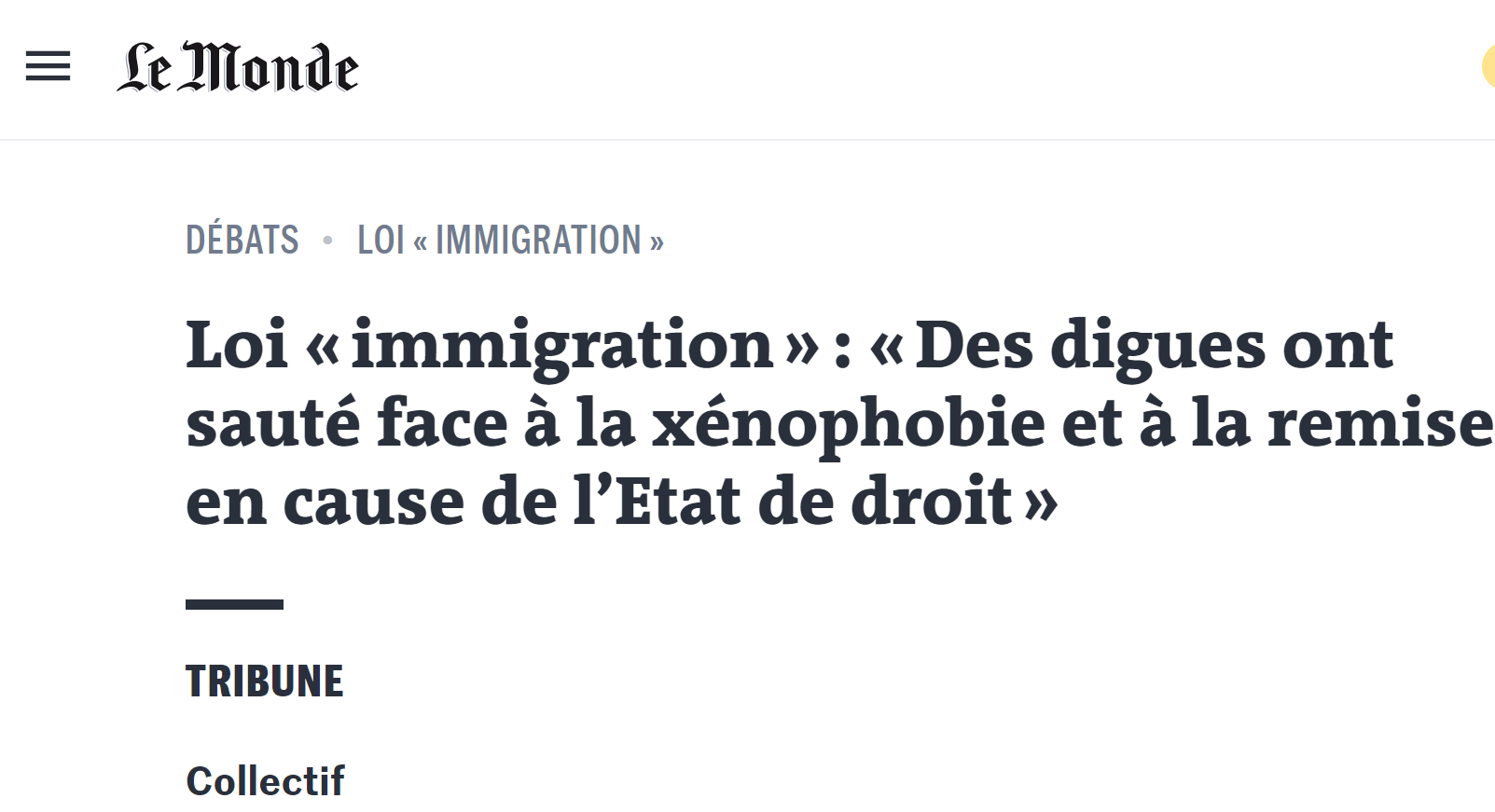 Tribune parue dans Le Monde le 15 février 2024 à lire ici : https://www.lemonde.fr/idees/article/2024/02/15/loi-immigration-des-digues-ont-saute-face-a-la-xenophobie-et-a-la-remise-en-cause-de-l-etat-de-droit_6216711_3232.html