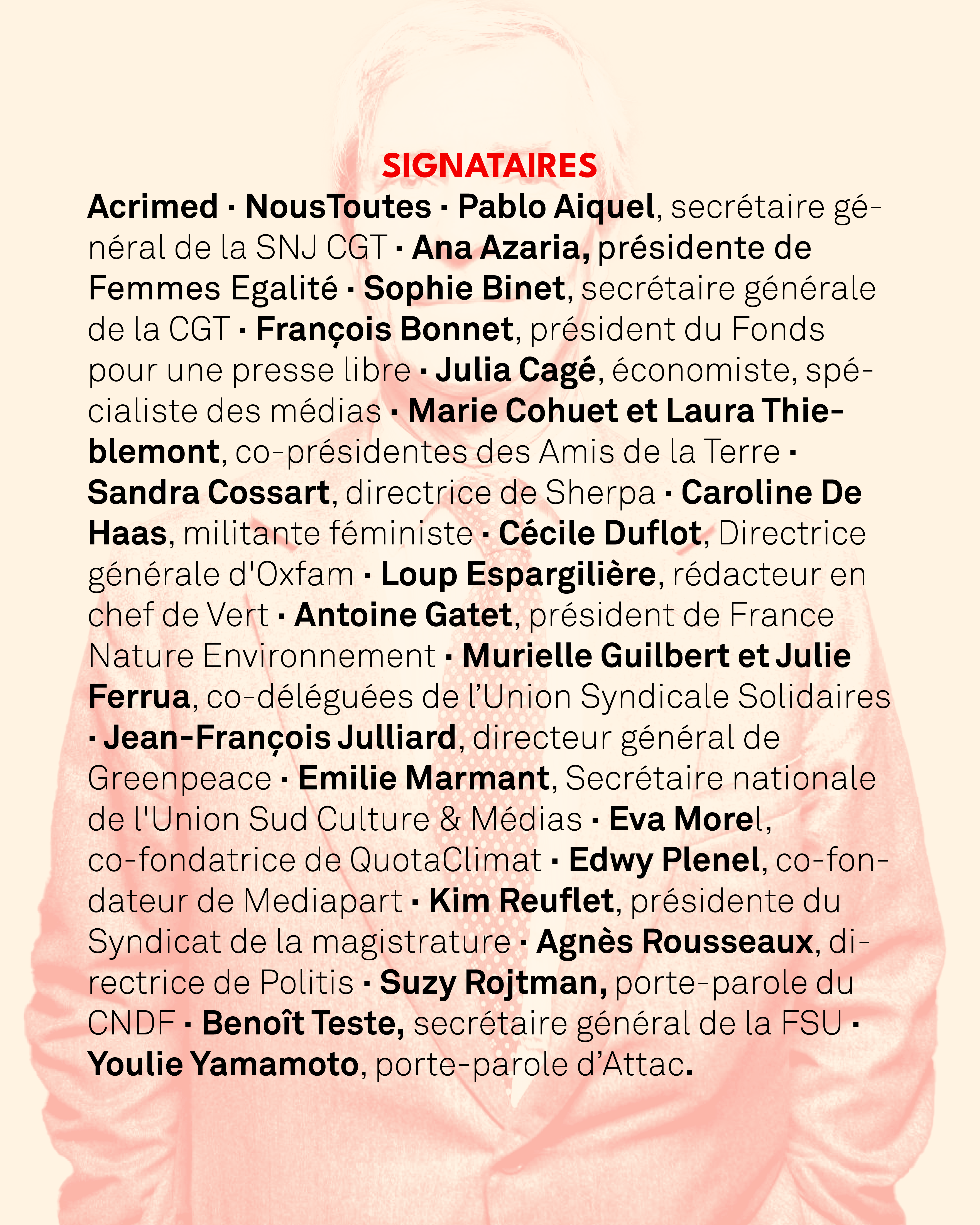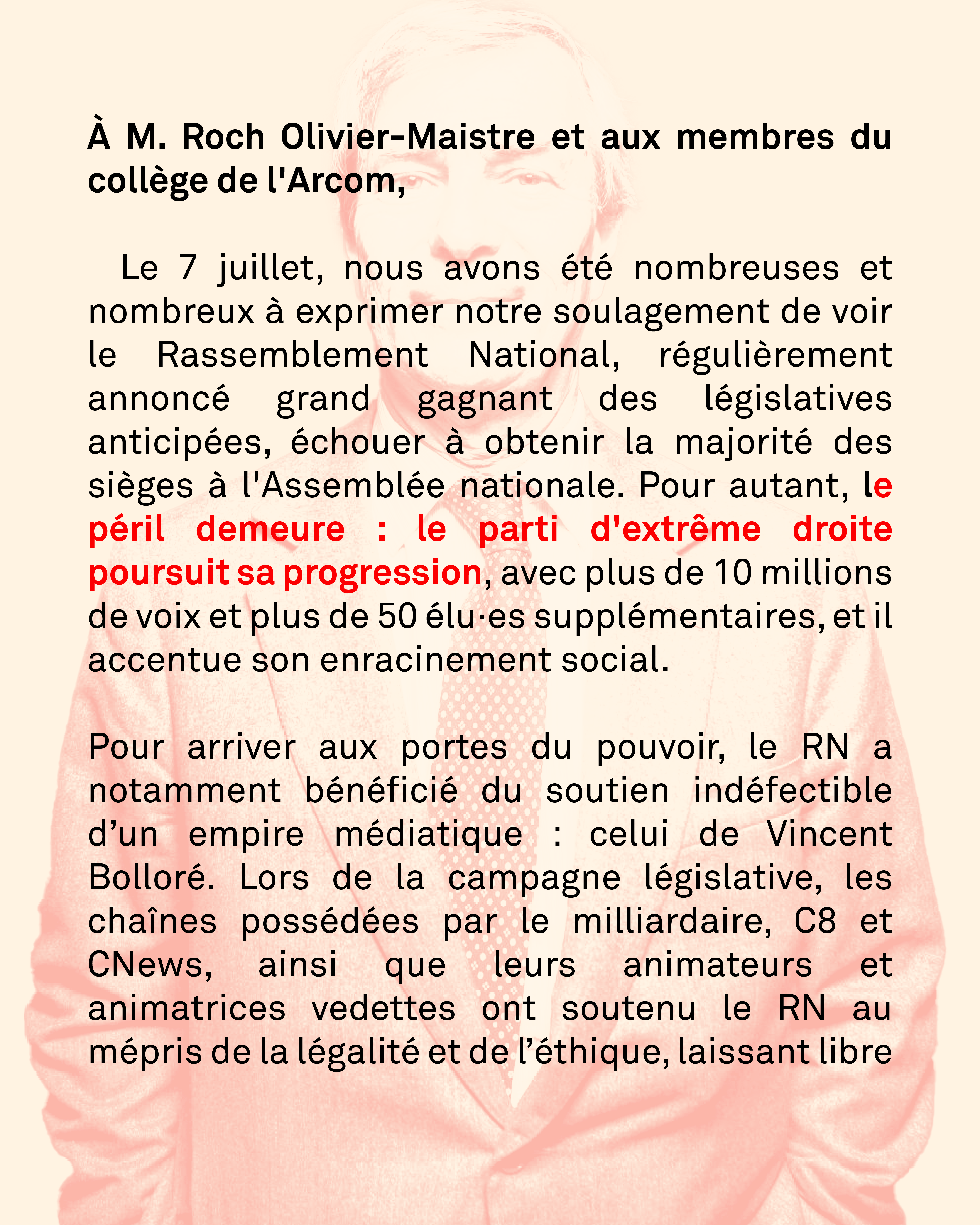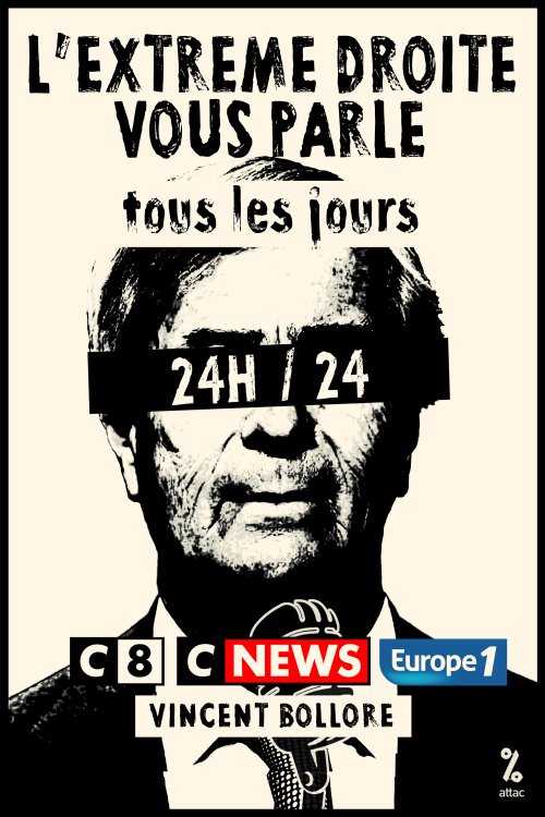 Pour arriver aux portes du pouvoir, le RN a notamment bénéficié du soutien indéfectible d’un empire médiatique : celui de Vincent Bolloré. Lors de la campagne législative, les chaînes possédées par le milliardaire, C8 et CNews, ainsi que leurs animateurs et animatrices vedettes ont soutenu le RN au mépris de la légalité et de l’éthique, laissant libre cours aux idées réactionnaires et racistes de l'extrême droite.