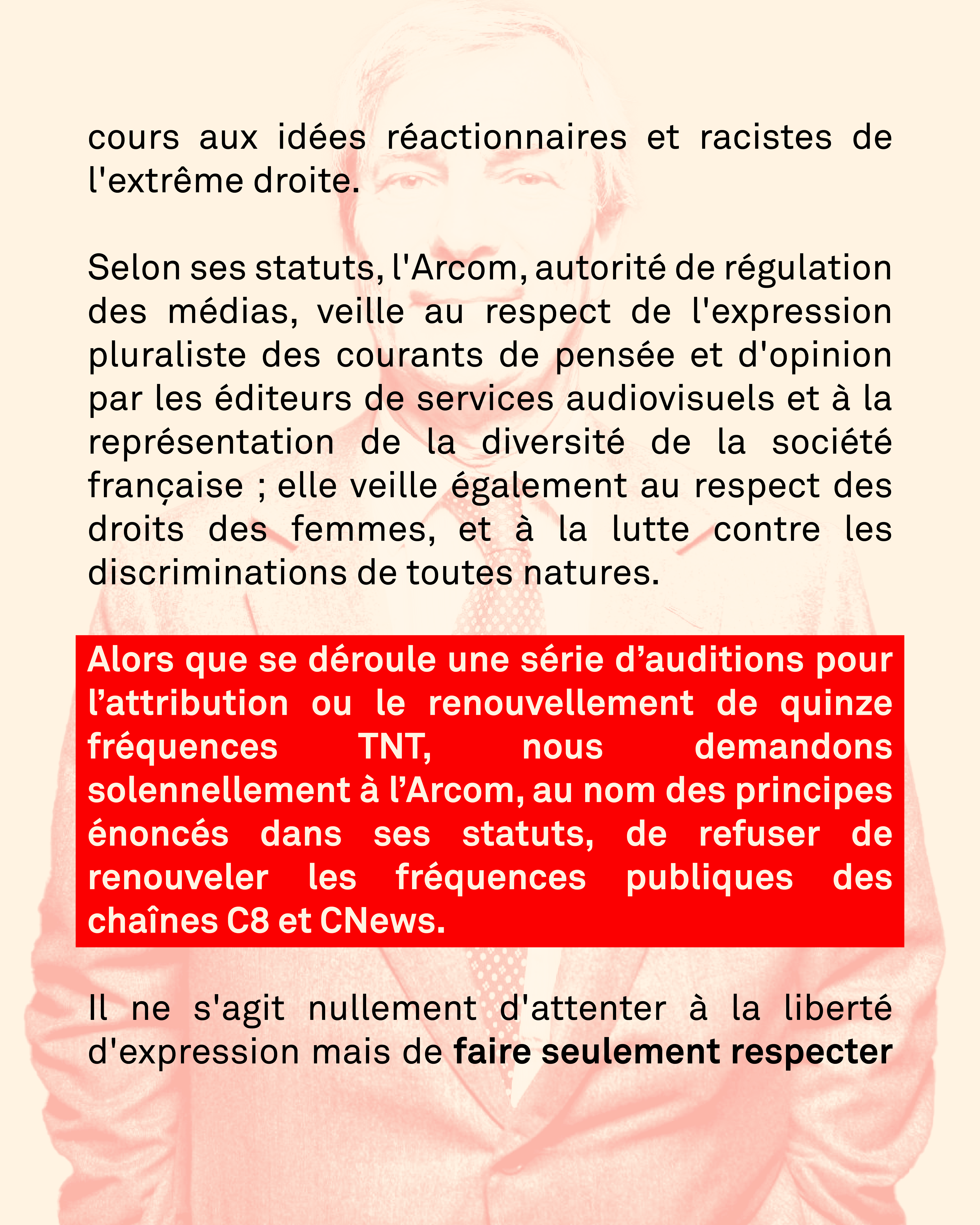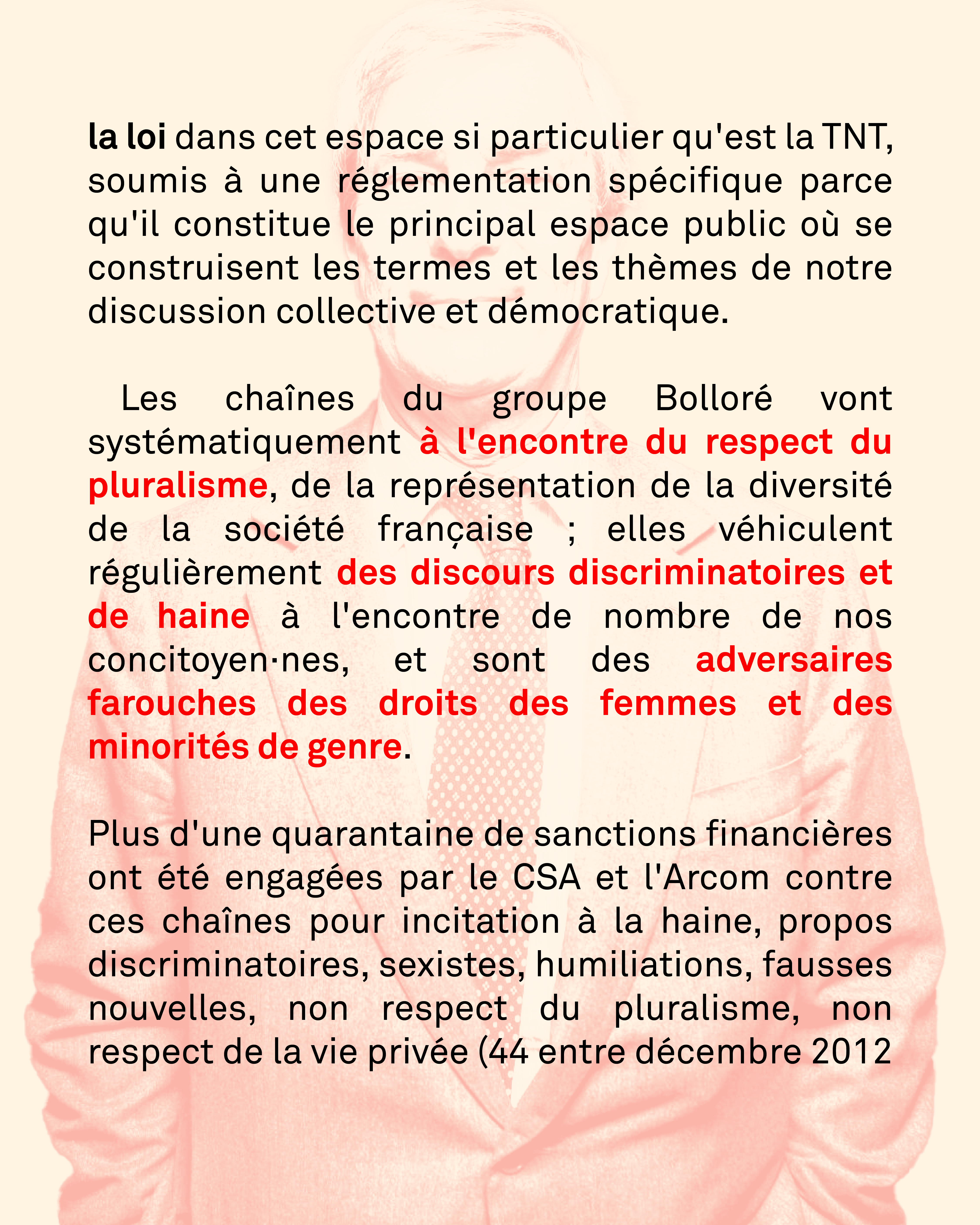 Les chaînes du groupe Bolloré vont systématiquement à l'encontre du respect du pluralisme, de la représentation de la diversité de la société française ; elles véhiculent régulièrement des discours discriminatoires et de haine à l'encontre de nombre de nos concitoyen·nes, et sont des adversaires farouches des droits des femmes et des minorités de genre.